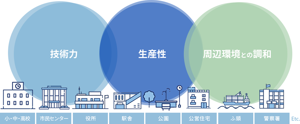 成電工は、庁舎、役所、教育施設、駅舎、公営住宅、公園など、社会や暮らしに欠かせない「公共施設」の電気設備の設計・施工を数多く手掛けています。